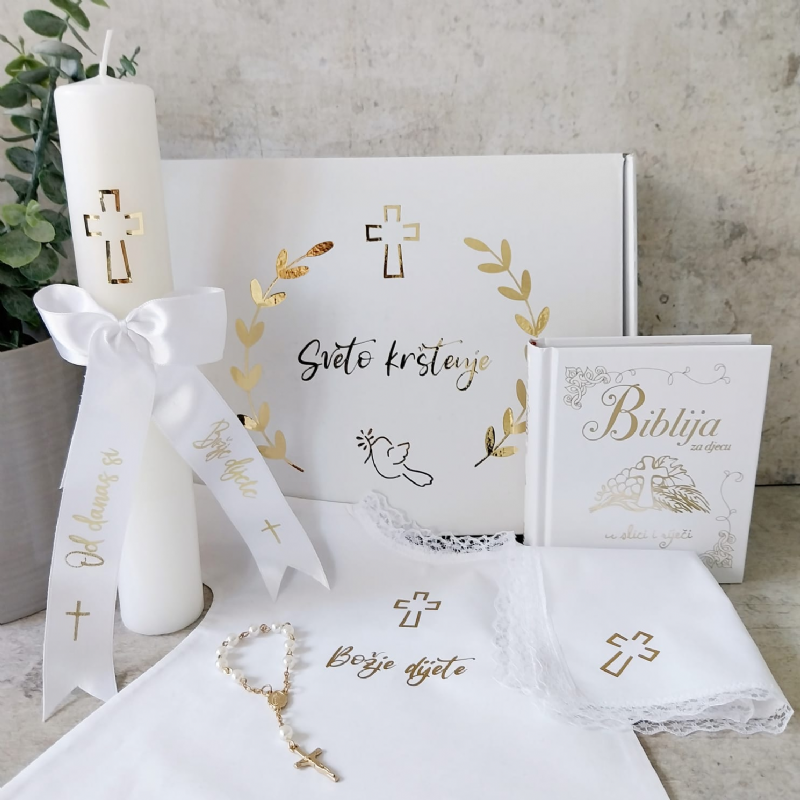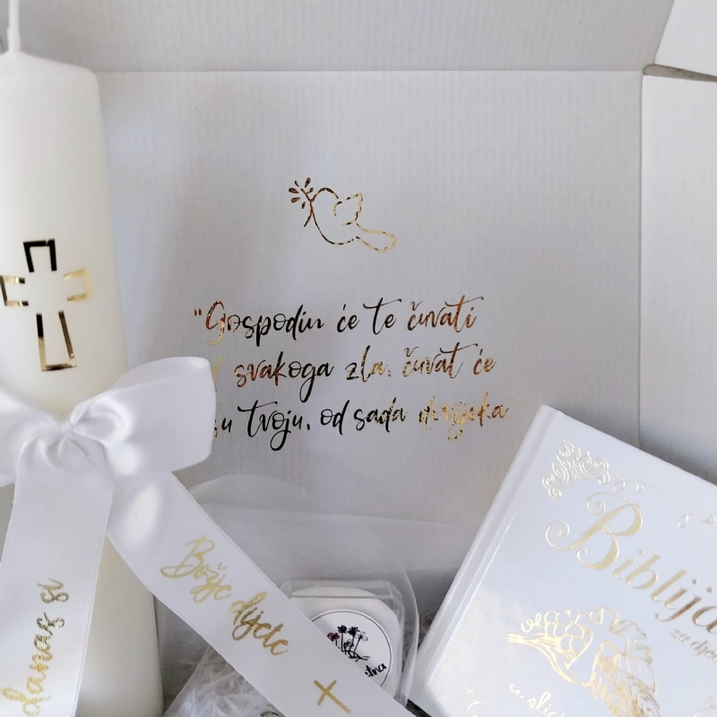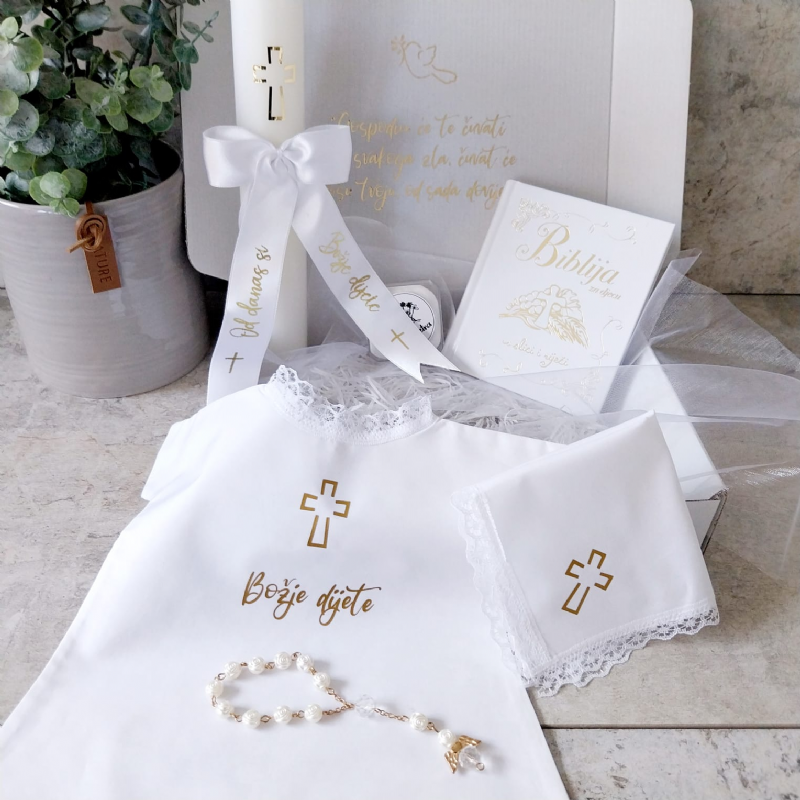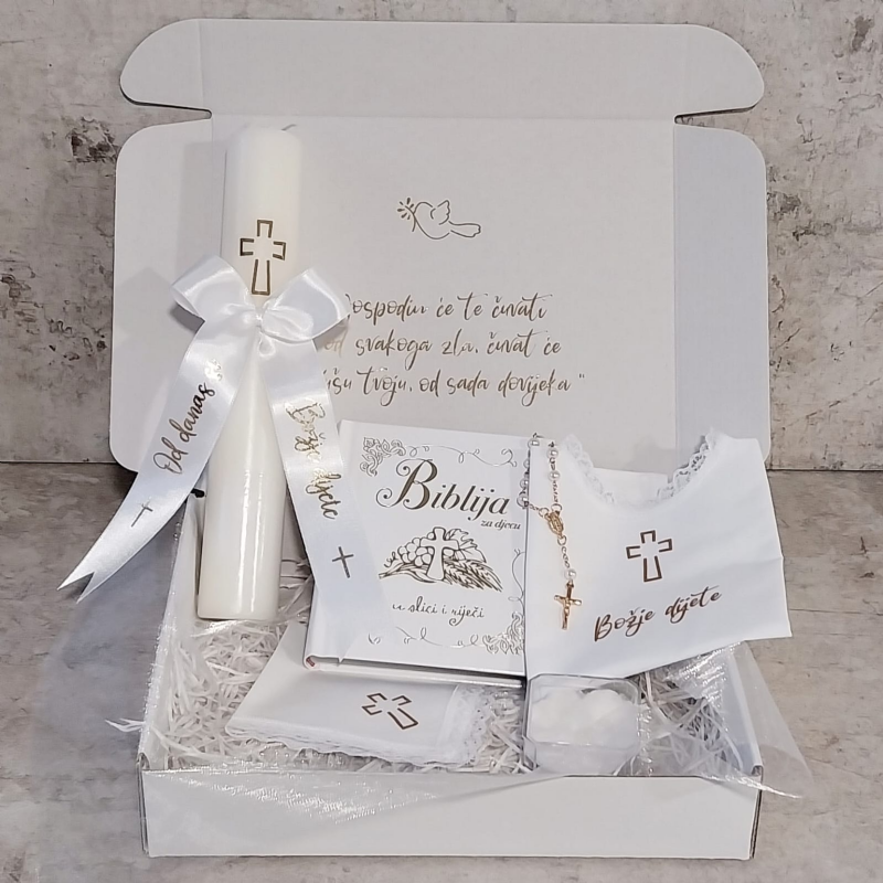 Dodatno u poklon paketu za krštenje nalazi se krsna svijeća sa satenskom mašnom i natpisom "Od danas si dijete Božje”, krsna košuljica sa križem i natpisom "Božje dijete”, krsna maramica sa otisnutim zlatnim križem, te mala krunica desetica. Krunice isporučujemo prema trenutnoj dostupnosti. Dodatno na unutarnjoj strani kutije zlatno je otisnut tekst Psalma 121:7,8 ” Gospodin će te čuvati od svakog zla, čuvat će dušu tvoju, od sada dovijeka”.